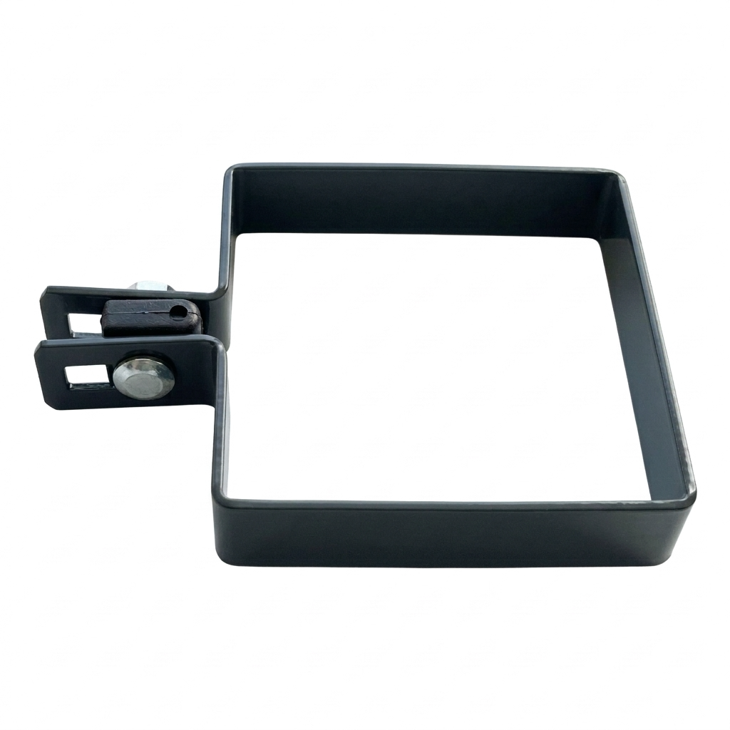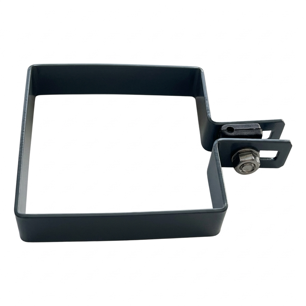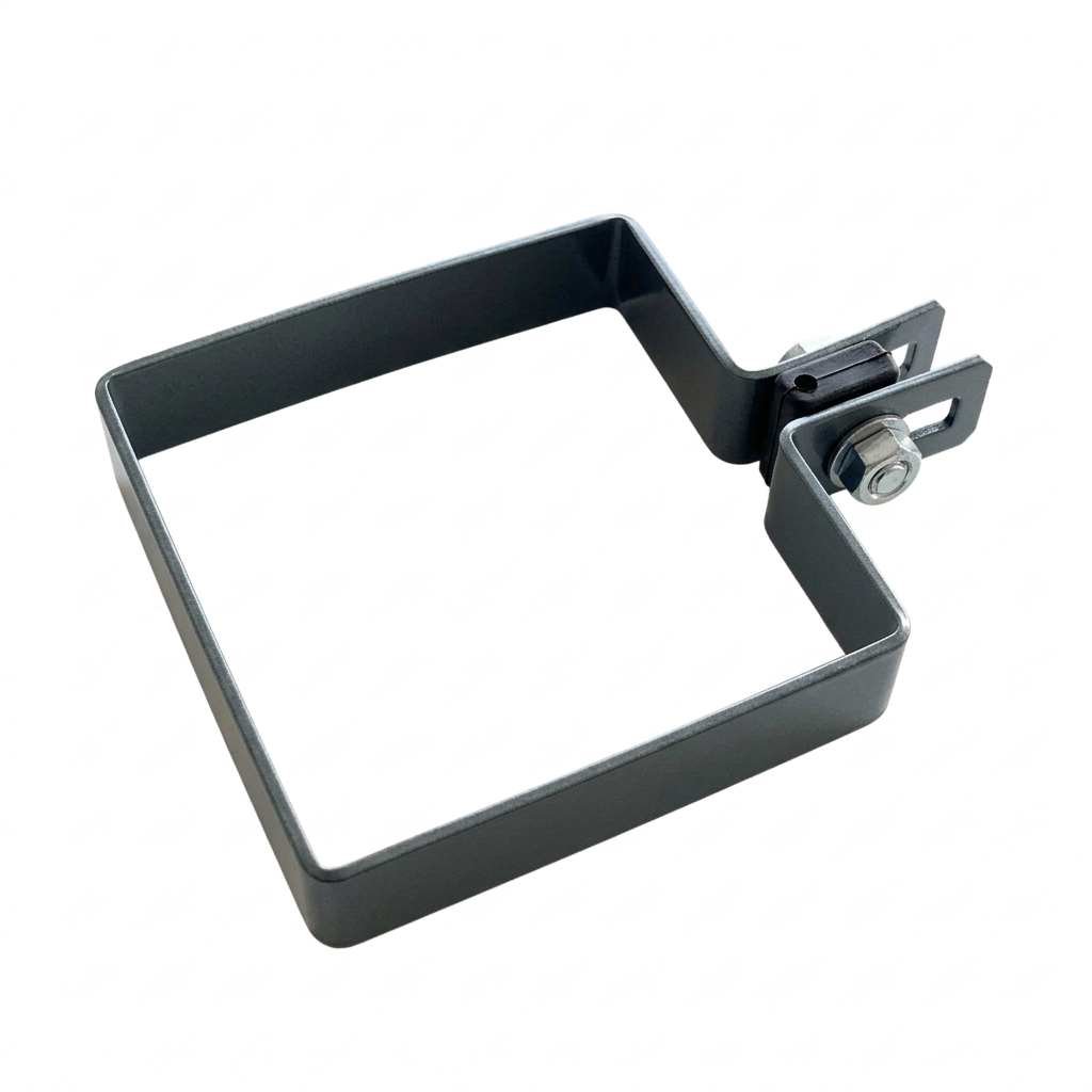 Abraçadeira terminal para painéis de vedação destinada à fixação de redes e painéis em postes com secção de 100×100 mm. O conjunto de montagem completo permite uma instalação rápida e segura de vedações tanto em investimentos privados como comerciais — sem necessidade de completar separadamente parafusos e espaçadores.