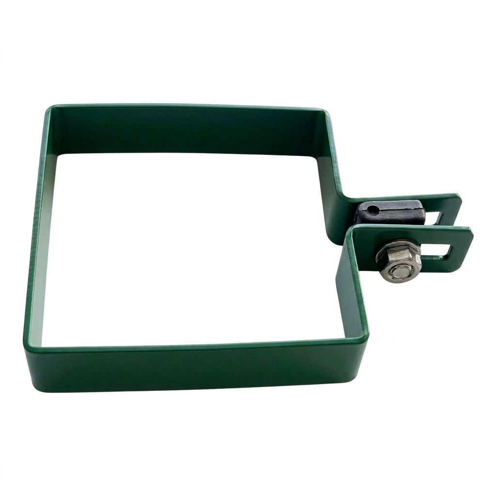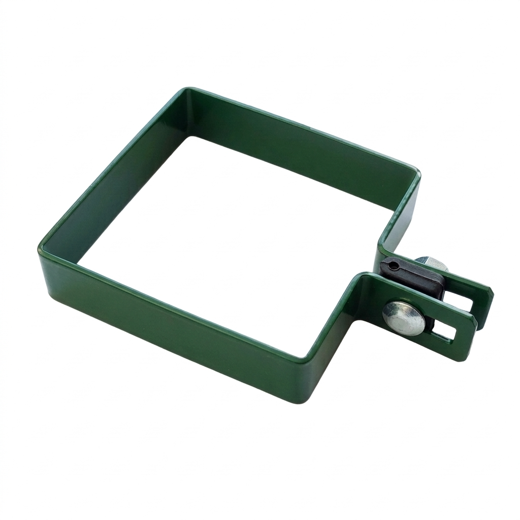 A abraçadeira é fabricada em chapa de aço com 2 mm de espessura revestida com revestimento em pó na cor verde RAL 6005, o que garante elevada resistência à corrosão, aspecto estético e durabilidade de muitos anos em condições atmosféricas variáveis. A cor RAL 6005 combina perfeitamente com os sistemas de vedação em painel mais populares disponíveis no mercado. A construção sólida garante uma fixação estável do painel de vedação ao poste, eliminando o risco de afrouxamento da fixação sob influência do vento ou vibrações.