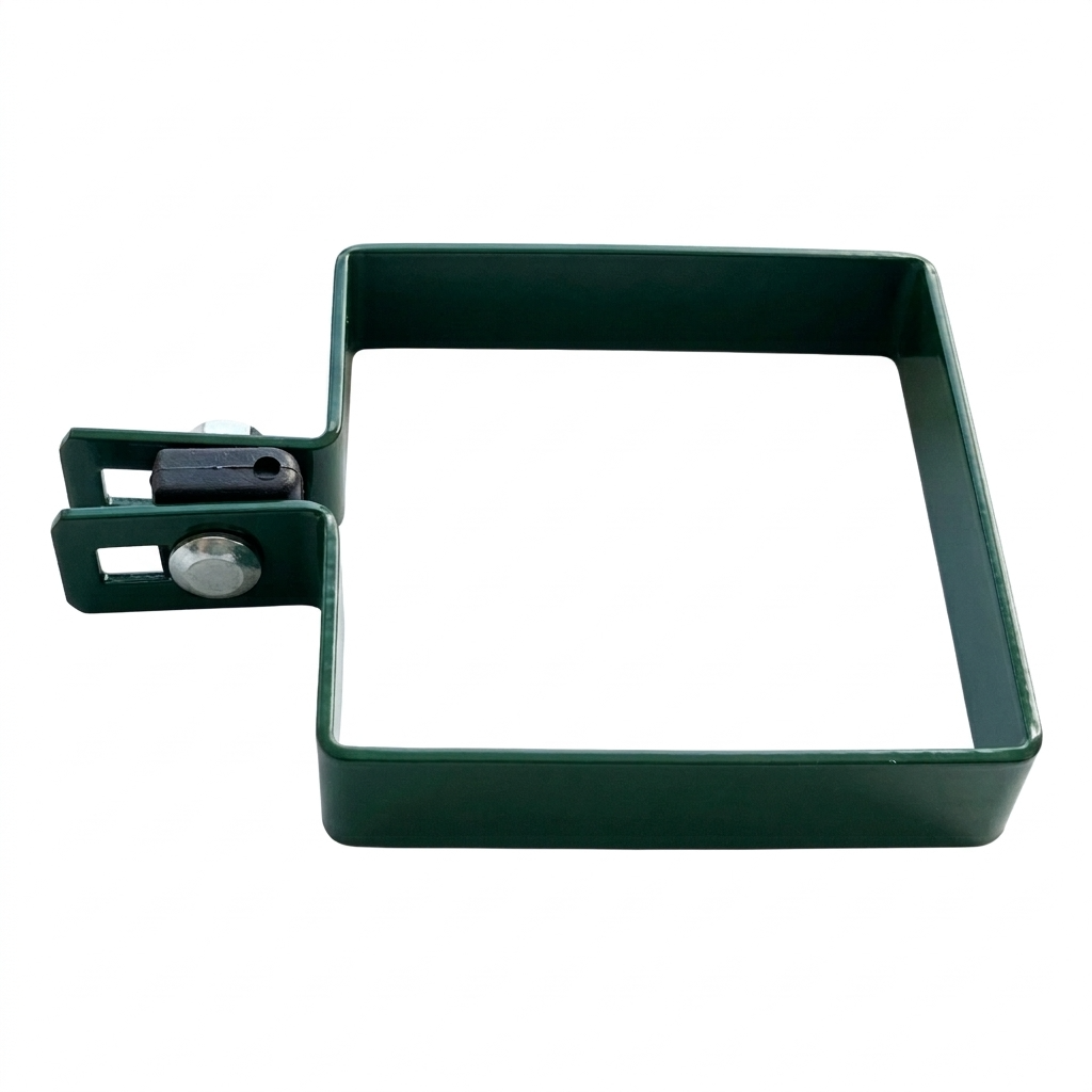 Abraçadeira terminal para painéis de vedação destinada à fixação de redes e painéis em postes com secção 100×100 mm. O conjunto de montagem completo permite uma instalação rápida e segura da vedação tanto em investimentos privados como comerciais — sem necessidade de completar separadamente parafusos e espaçadores.