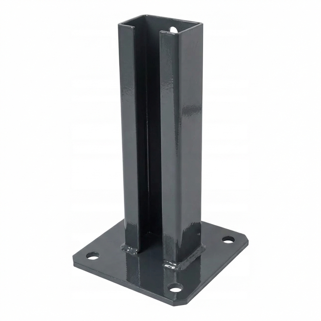 Produto dedicado a postes com perfil de secção 60×40 mm, utilizados em vedações de painéis. A base permite uma montagem rápida e segura através de parafusos ou buchas para betão — basta fixá-la ao solo através dos quatro orifícios pré-perfurados de fábrica e inserir o poste no perfil do suporte.