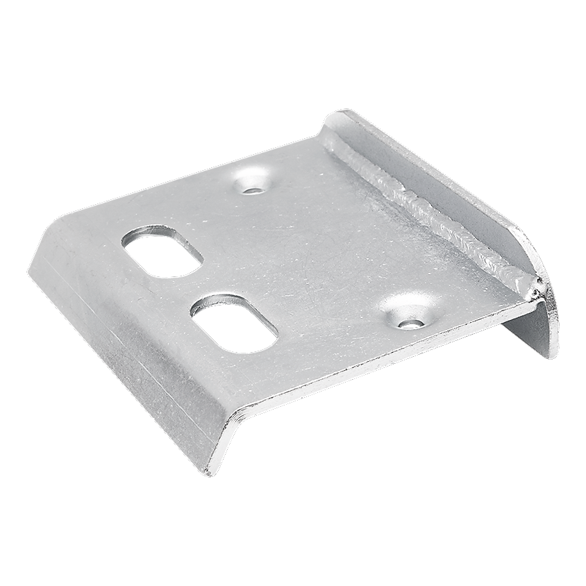 A construção sólida em chapa de aço com espessura de 5 mm garante durabilidade mecânica, e o perfil bem pensado com dobras assegura rigidez e estabilidade após montagem. Dois furos redondos (Ø 8,5 mm) servem para aparafusar o batente ao solo, enquanto dois furos oblongos permitem a montagem do ferrolho com possibilidade de regulação da posição.