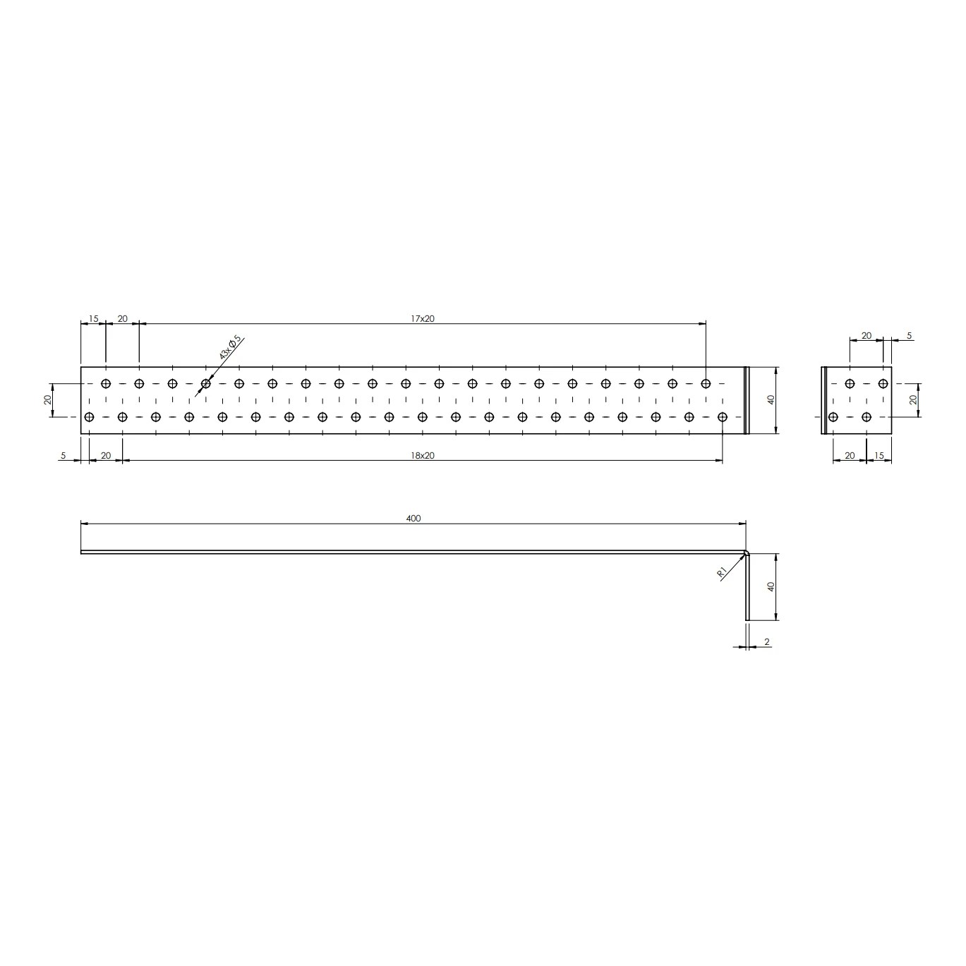 - Furos: 44 un. × ⌀5,0 mm