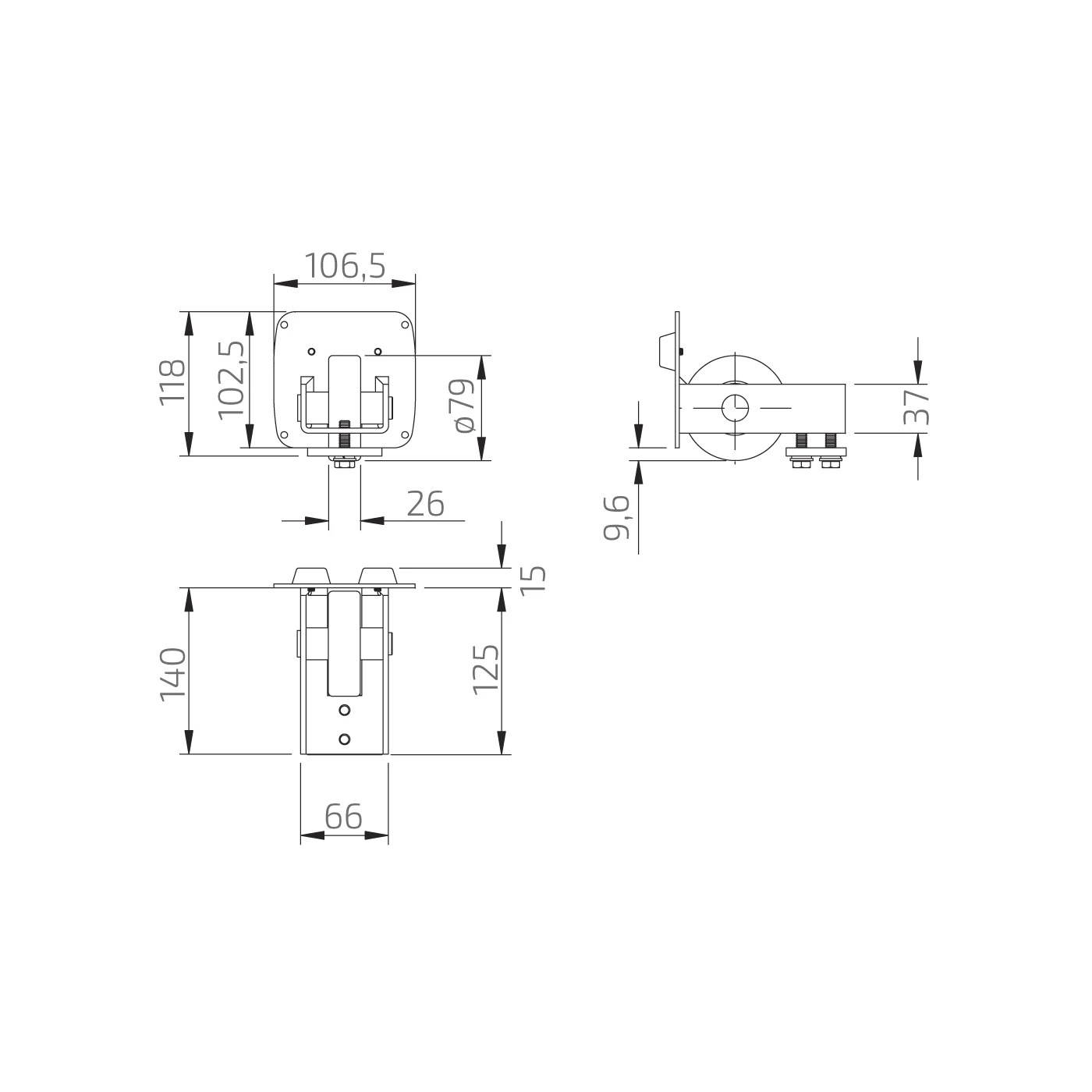 O corpo fabricado em aço galvanizado garante alta resistência à corrosão mesmo em condições atmosféricas adversas, e a roda de nylon com diâmetro ø79 mm assegura um funcionamento silencioso e sem avarias durante muitos anos de exploração. As dimensões compactas e peso de apenas 1,25 kg minimizam a carga na estrutura do portão e facilitam a montagem.