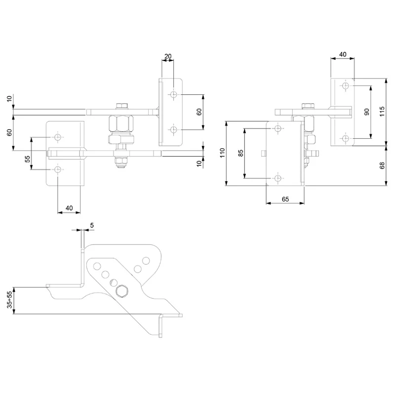 - Distância entre furos da placa inferior na vertical: 85 mm (vista direita) / 55 mm (vista esquerda)