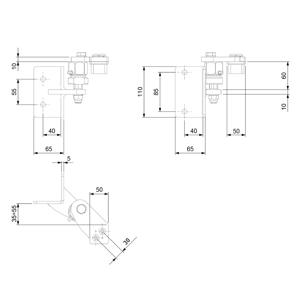 - Distância entre furos de montagem (vertical): 55 mm (suporte) / 85 mm (chapa lateral)