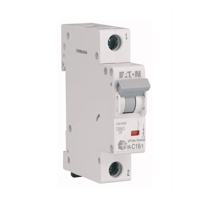 O C 16A 1P 6kA HN-C16/1 xPole Home disjuntor de sobrecorrente 194831 EATON protege a instalação eléctrica contra sobrecargas e curto-circuitos.