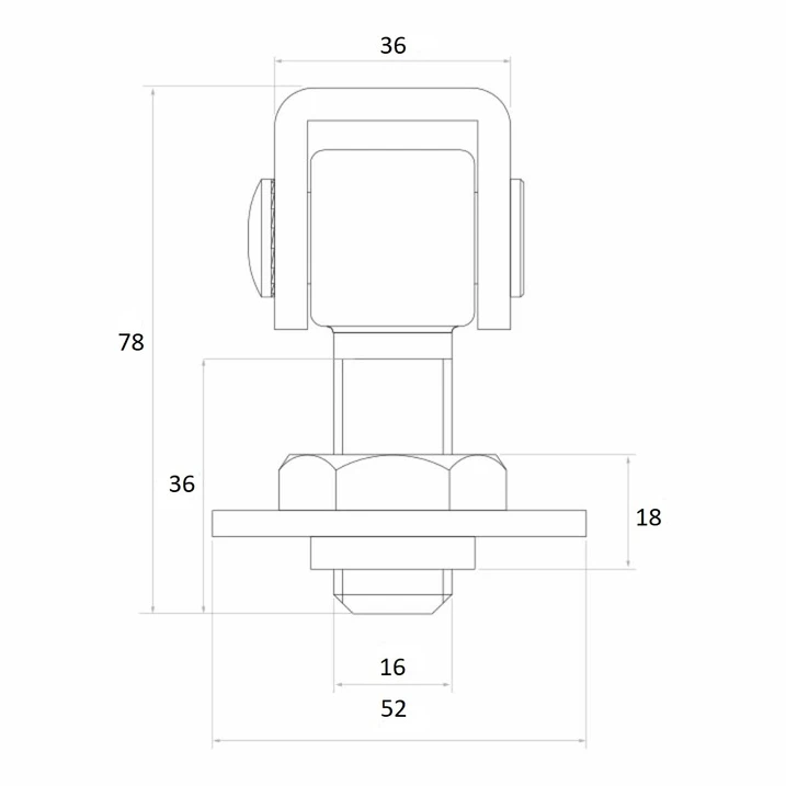 A construção combina um parafuso zincado com espelho e uma argola em aço preto, destinada a ser soldada diretamente na estrutura do portão ou no poste. Esta solução garante uma ligação duradoura e esteticamente cuidada, permitindo ao mesmo tempo o ajuste da altura e da pressão da folha em qualquer momento — basta apertar ou desapertar a porca.