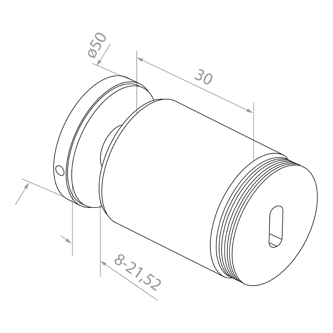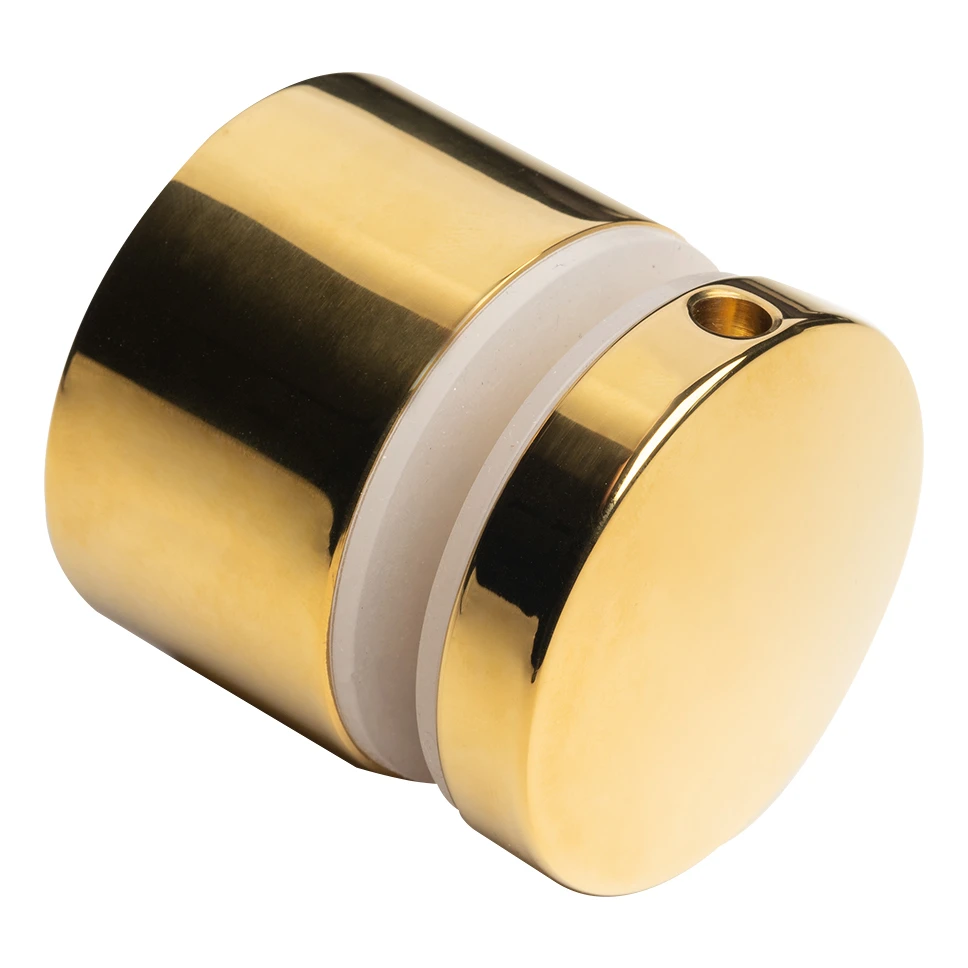Fixação pontual dourada para vidro Ø50 mm em aço inoxidável AISI 304 com revestimento PVD brilhante — elemento de fixação profissional para painéis de vidro com espessura de 8 a 21,52 mm. Destinada à montagem em superfícies planas, garante uma fixação estável e estética do vidro tanto no interior do edifício como no exterior.