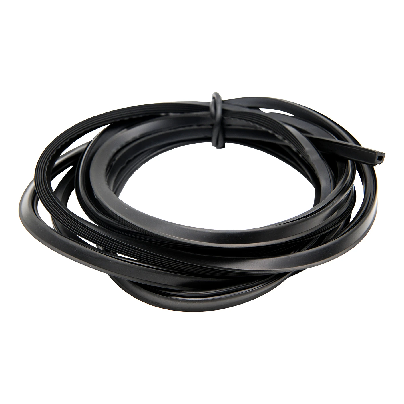O kit inclui dois vedantes de borracha com 2500 mm de comprimento cada — frontal e traseiro. Ambos os elementos são fabricados em borracha elástica de cor preta. O vedante traseiro (mais largo, com um perfil ondulado pronunciado) é responsável pela estabilização principal do vidro no canal do perfil, enquanto o vedante frontal (mais estreito, com perfil plano) fecha o espaço de montagem e garante um acabamento estético. Em conjunto, formam um sistema de pressão que mantém firmemente a folha de vidro e a protege de vibrações e micromovimentos.