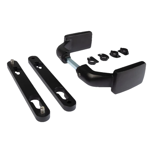 O punho ergonómico foi especialmente projetado para evitar o atrito da mão na chapa de apoio do poste — esta é uma vantagem importante na utilização intensiva em instalações comerciais e industriais. O kit inclui duas chapas de montagem, um par de puxadores, veio de ligação e parafusos de fixação com porcas borboleta, garantindo uma montagem rápida e sem problemas.