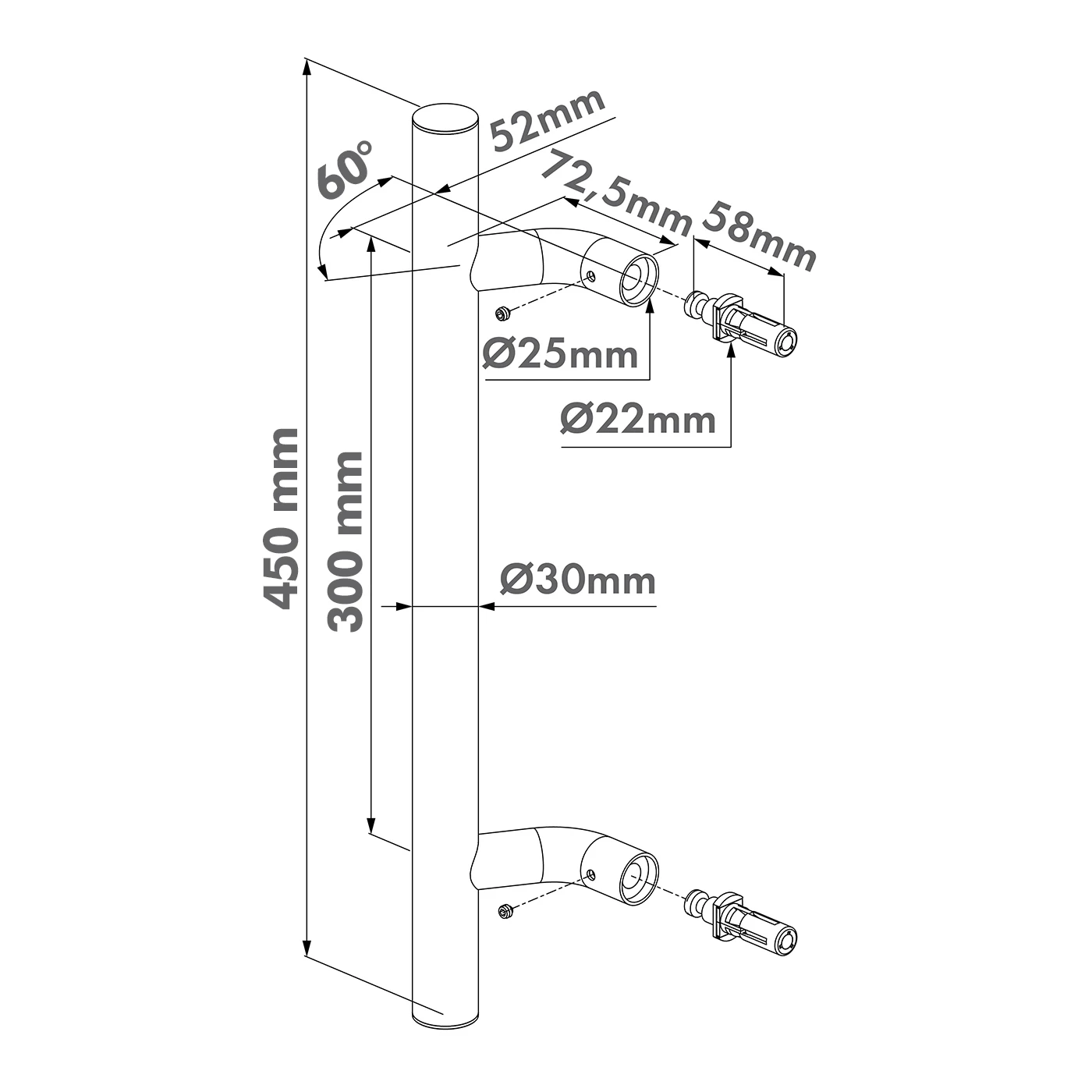 O puxador é montado através de dois braços terminados em espigões de ancoragem com diâmetro Ø22 mm, inseridos em furos no perfil do portão. Os espigões são bloqueados por parafusos de aperto (parafusos sem fim), o que permite montagem rápida sem soldadura. A distância entre pontos de fixação é 300 mm, e o ângulo de inclinação dos braços 60° garante um punho ergonómico e aparência estética no perfil.