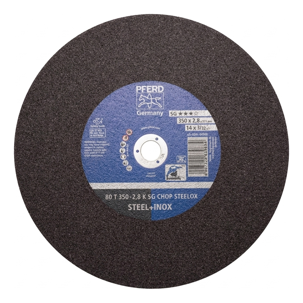 PFERD 80 T 350-2,8 K SG CHOP STEELOX é um disco de corte de alto desempenho projetado especificamente para trabalhar com corta-ferros de mesa (chop saws). Destinado ao corte de aço estrutural e aço inoxidável (INOX), proporciona corte rápido, limpo e preciso — mesmo sob exploração intensiva em obra ou oficina de instalações.