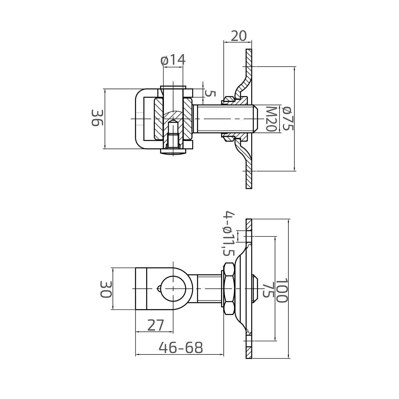 Uma das principais vantagens desta dobradiça é a regulação contínua no intervalo de 46 a 68 mm (distância do eixo do perno ao plano de montagem). Isto permite o ajuste preciso da posição da folha do portão após a montagem da placa, sendo particularmente importante em pilares desnivelados ou para compensar tolerâncias de execução. A rosca M20 garante uma fixação sólida e segura, e os quatro furos de montagem com diâmetro ø11,5 mm com espaçamento de 75 mm permitem aparafusar de forma estável a placa ao pilar ou muro.