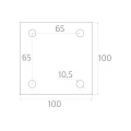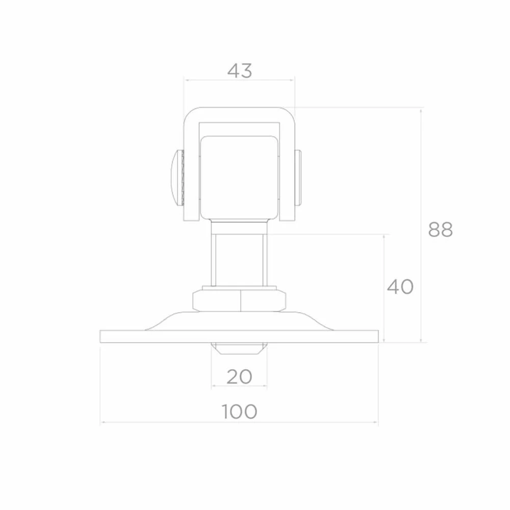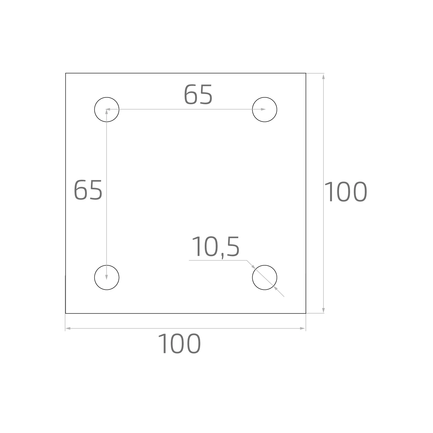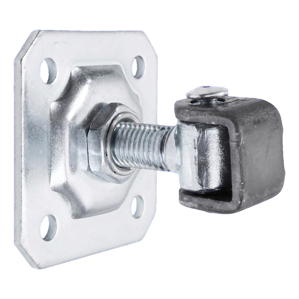 A dobradiça destina-se à montagem em pilares de portões de batente — de aço, alvenaria ou betão. Quatro furos de montagem na chapa (Ø 10,5 mm) permitem a fixação segura ao substrato através de parafusos ou buchas apropriadas. Após fixar a chapa no pilar e o olhal no batente do portão, basta apertar a porca de regulação na rosca M20 para definir a posição desejada do batente. A regulação pode ser repetida múltiplas vezes — isto é particularmente útil no inverno, quando o metal se contrai sob influência das baixas temperaturas, e no verão, quando se expande termicamente.