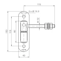 A dobradiça é composta por duas buchas de aço rolamentadas assentes num eixo comum de rotação, ligadas à chapa de montagem. O espigão horizontal com rosca M12 termina numa esfera, sobre a qual se coloca a parte correspondente do portão. A porca de regulação no espigão permite regulação contínua da altura de suspensão do portão – basta desapertar a porca, ajustar a posição adequada e voltar a apertar. Esta construção elimina a necessidade de desmontagem para correção do ajuste, o que é particularmente útil após cedência da estrutura ou em condições de grandes variações de temperatura, quando o metal altera as suas dimensões.