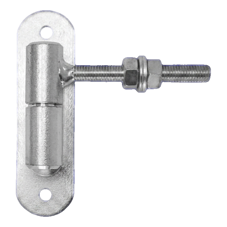 Dobradiça regulável rolamentada em aço com esfera e chapa de montagem – solução fiável para suspensão de portões de vedação. A rosca M12 com porca de regulação permite o ajuste preciso do prumo do portão a qualquer momento – tanto logo após a montagem como durante o uso, quando a estrutura ceda ou as condições térmicas se alterem.