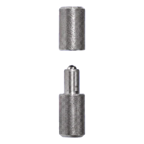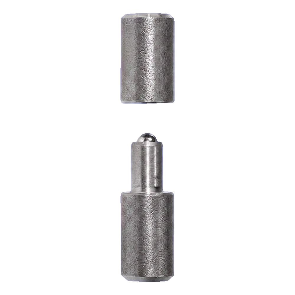 A dobradiça consiste em dois elementos torneados com precisão — bucha (parte superior) e perno com esfera (parte inferior). A esfera de aço inserida no perno minimiza o atrito e garante o funcionamento silencioso e uniforme da dobradiça durante todo o período de utilização. O torneamento CNC garante a repetibilidade das dimensões e o ajuste preciso de ambas as partes.