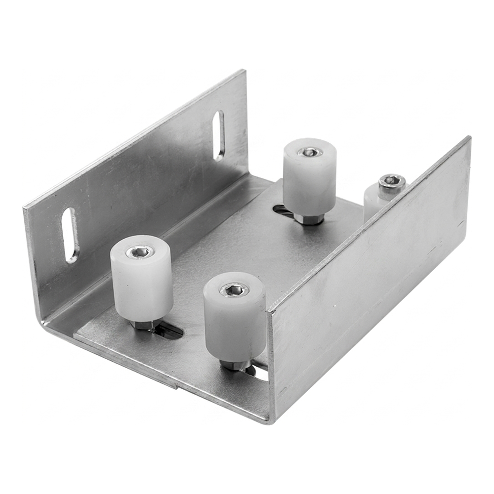 A guia superior ajustável PSG é um elemento de aço que estabiliza o portão de correr verticalmente durante o seu movimento. O suporte equipado com quatro rolos de plástico permite um ajuste preciso à espessura do perfil superior do portão graças aos furos de montagem ajustáveis (rasgos oblongos) e à possibilidade de extensão das placas. Solução destinada tanto a portões autoportantes como a portões sobre carril, garantindo um funcionamento suave e silencioso do mecanismo de correr.