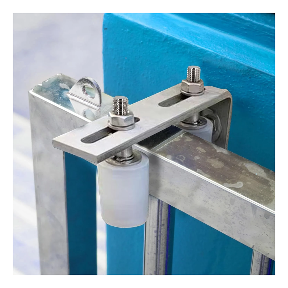 A guia monta-se na parte superior do poste da vedação ou parede, onde abraça a folha do portão com duas roldanas. O espaçamento regulável das roldanas (luz 49–79 mm) permite adaptação a diferentes perfis fechados utilizados em portões deslizantes. Os parafusos M12 permitem aperto seguro das roldanas, e os orifícios de montagem alongados no suporte de parede facilitam o nivelamento preciso.