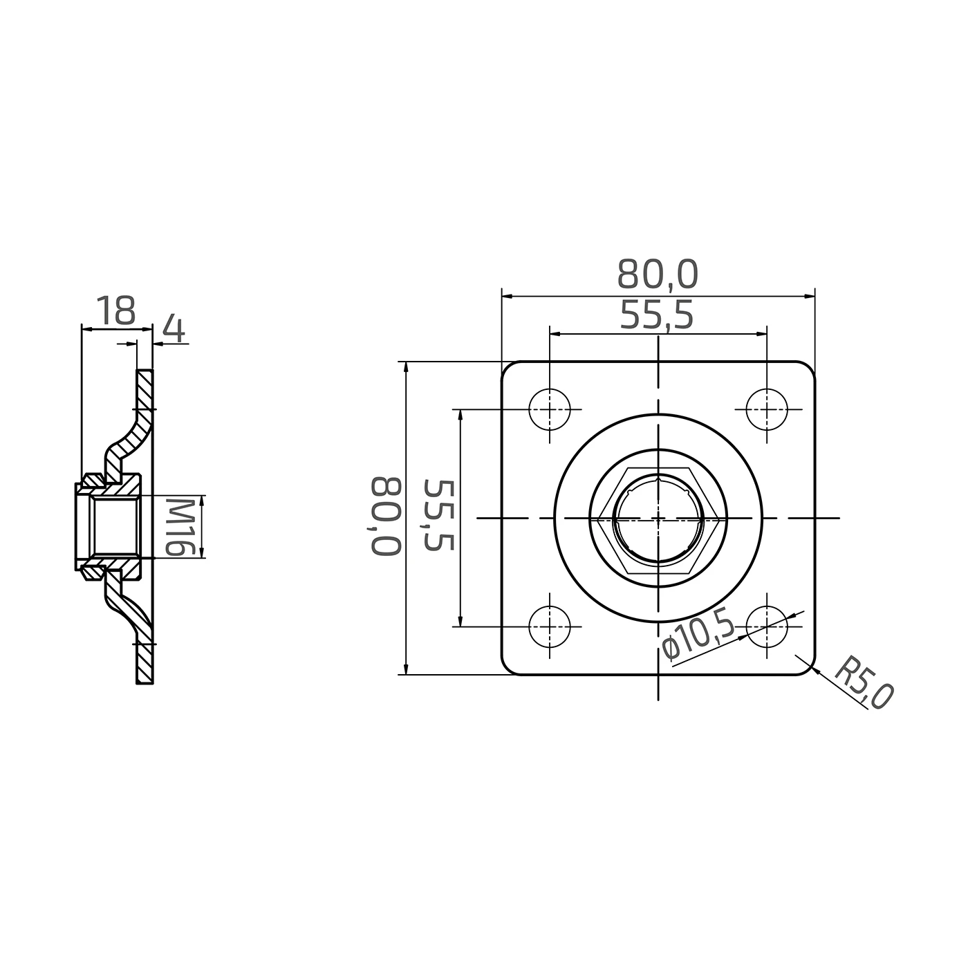 A placa é montada com quatro parafusos (nos furos de diâmetro ø10,5 mm) diretamente no poste do portão ou estrutura da armação. A distância entre furos 55,5 × 55,5 mm permite uma distribuição estável das forças em toda a superfície da ligação. Na porca central aparafusa-se o eixo da dobradiça regulável com rosca M16, o que permite o ajuste preciso da posição da folha do portão após a montagem.
