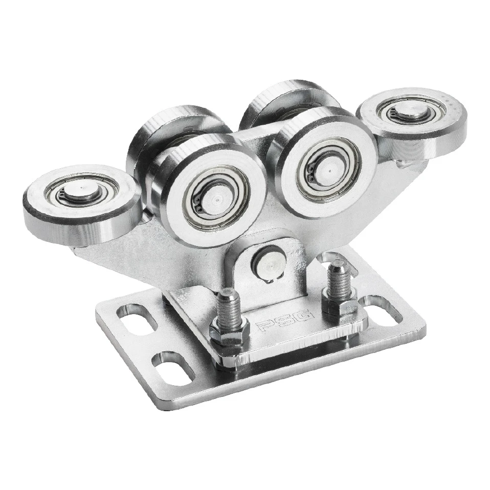 O carrinho de rodagem com 6 rolos de aço (incluindo dois rolos horizontais) constitui o núcleo do sistema deslizante. A construção oscilante, ligada à base por meio de um pino, permite o ajuste automático ao carril do portão, eliminando tensões e garantindo uma distribuição uniforme do peso.