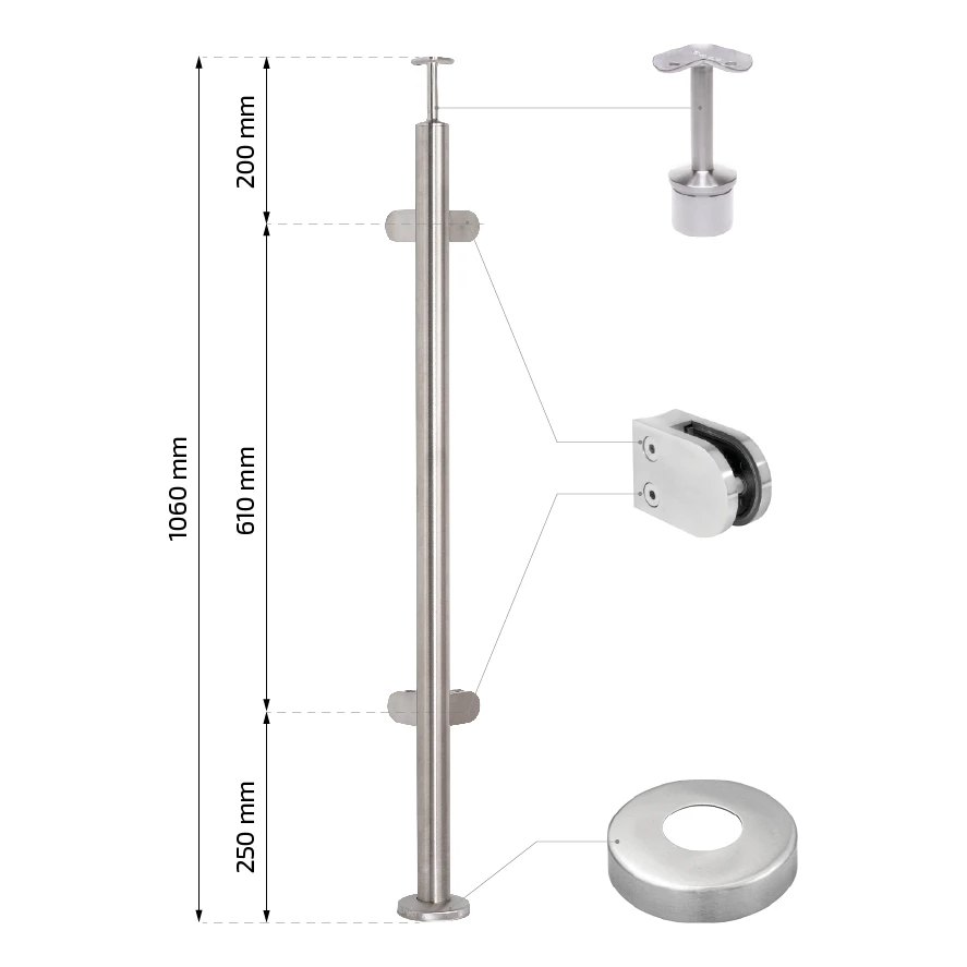 Pilar de balaustrada de canto para vidro ø42,4x1060/1102,4mm 4 fixações polido