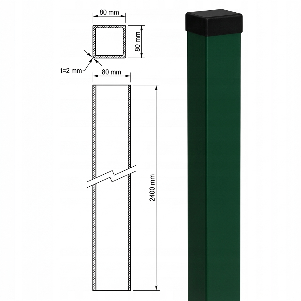 Poste de vedação 80×80 mm na cor verde RAL 6005 é um elemento estrutural robusto destinado à construção de vedações em painel, tramos, portões pedonais e portões de entrada leves. Graças à dupla proteção anticorrosão — zinco Z140 combinado com tinta em pó (poliéster brilhante) — o poste mantém um excelente aspeto e resistência às condições atmosféricas durante muitos anos, reduzindo os custos de manutenção e reclamações.