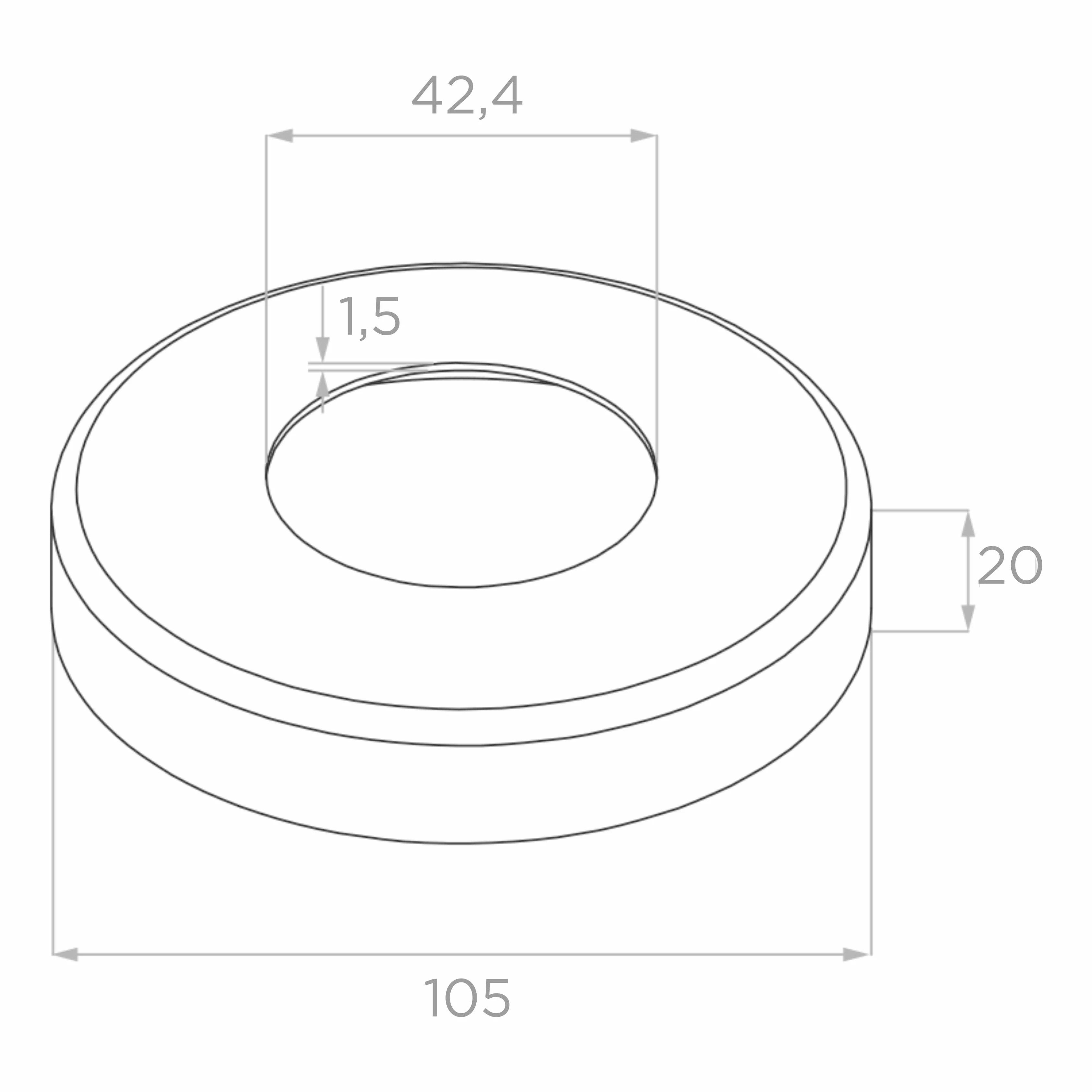 Roseta decorativa com diâmetro exterior de 105 mm e altura de 20 mm que cobre esteticamente o local de montagem do poste no pavimento. Furo interior ø 42,4 mm, espessura do material da aba 1,5 mm.