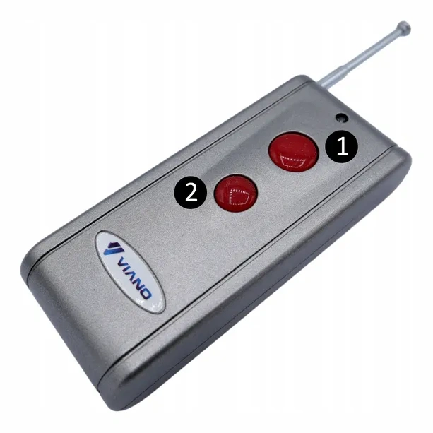O dispositivo é operado através do comando incluído com antena extensível. O botao 1 serve para ligar e desligar o repelente, e o botao 2 – para ativar a funçao flash e acionar manualmente a emissao de sons. O alcance do comando em espaço aberto é de até 500 m, permitindo controlo conveniente mesmo a grande distância.