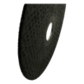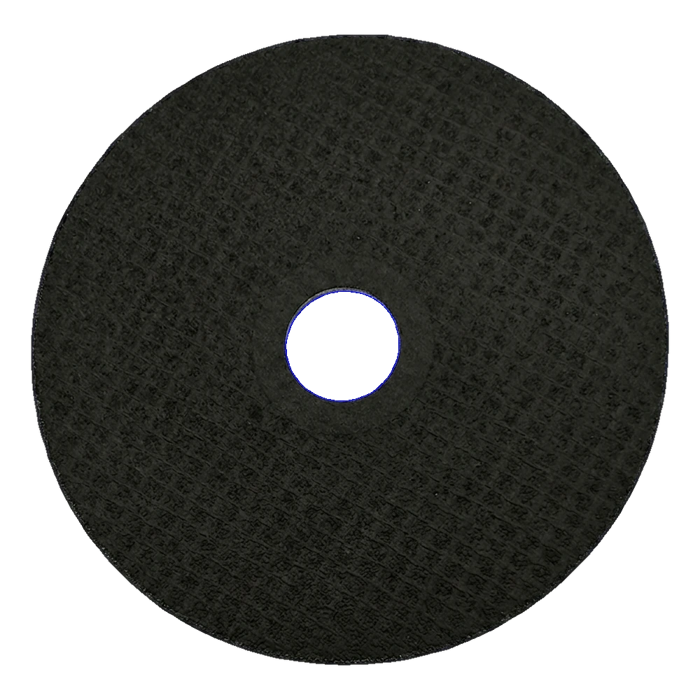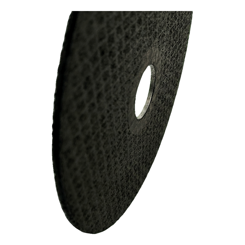O disco possui reforço com malha de fibra visível no lado posterior, que evita a desagregação do disco a altas rotações e garante uso seguro mesmo com carga lateral intensa. O ligante de resinas sintéticas proporciona resistência à alta temperatura gerada durante o corte, e os grãos abrasivos de coríndon expõem-se automaticamente à medida que se desgastam — mantendo a agressividade de corte constante durante todo o período de utilização.