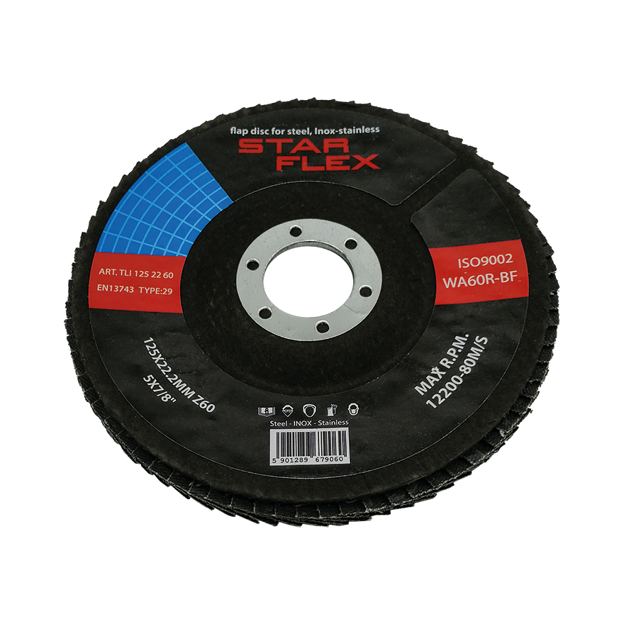 Disco laminar curvado Star Flex T29 com diâmetro de 125 mm com grão de zircónia e granulação 60 — ferramenta concebida para retificação intensiva de aço inoxidável (INOX) e aço carbono. O revestimento de zircónia garante propriedades de auto-afiação, permitindo que o disco mantenha elevado desempenho durante todo o período de utilização, resultando em menor desgaste de materiais e custos mais baixos de execução de trabalhos.