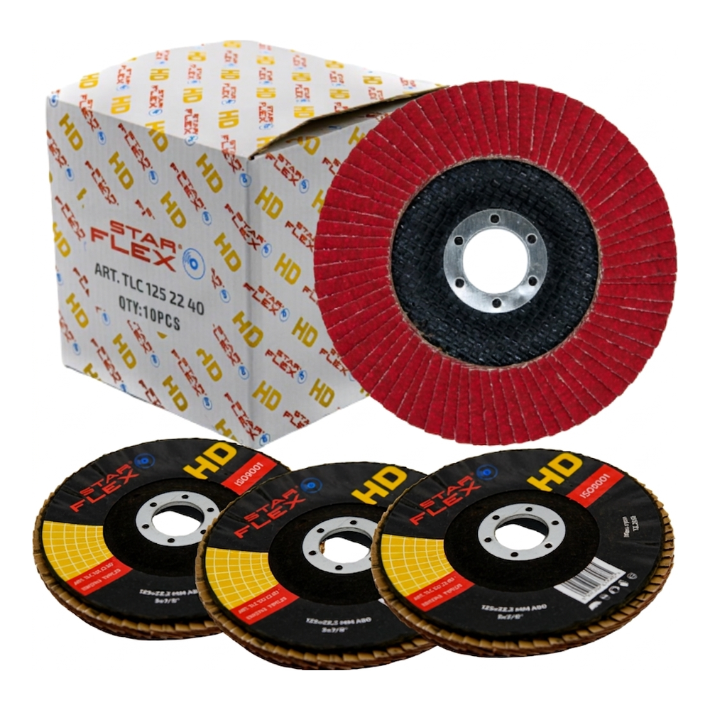 Starflex HD é um disco laminar cerâmico destinado ao trabalho intensivo em aço inoxidável (INOX), aço ao carbono, crómio, titânio e outros metais difíceis de cortar. O grão cerâmico auto-afiante garante máxima remoção de material em pouco tempo, garantindo simultaneamente o chamado corte frio — o elemento trabalhado não aquece nem muda de cor mesmo durante trabalho prolongado.