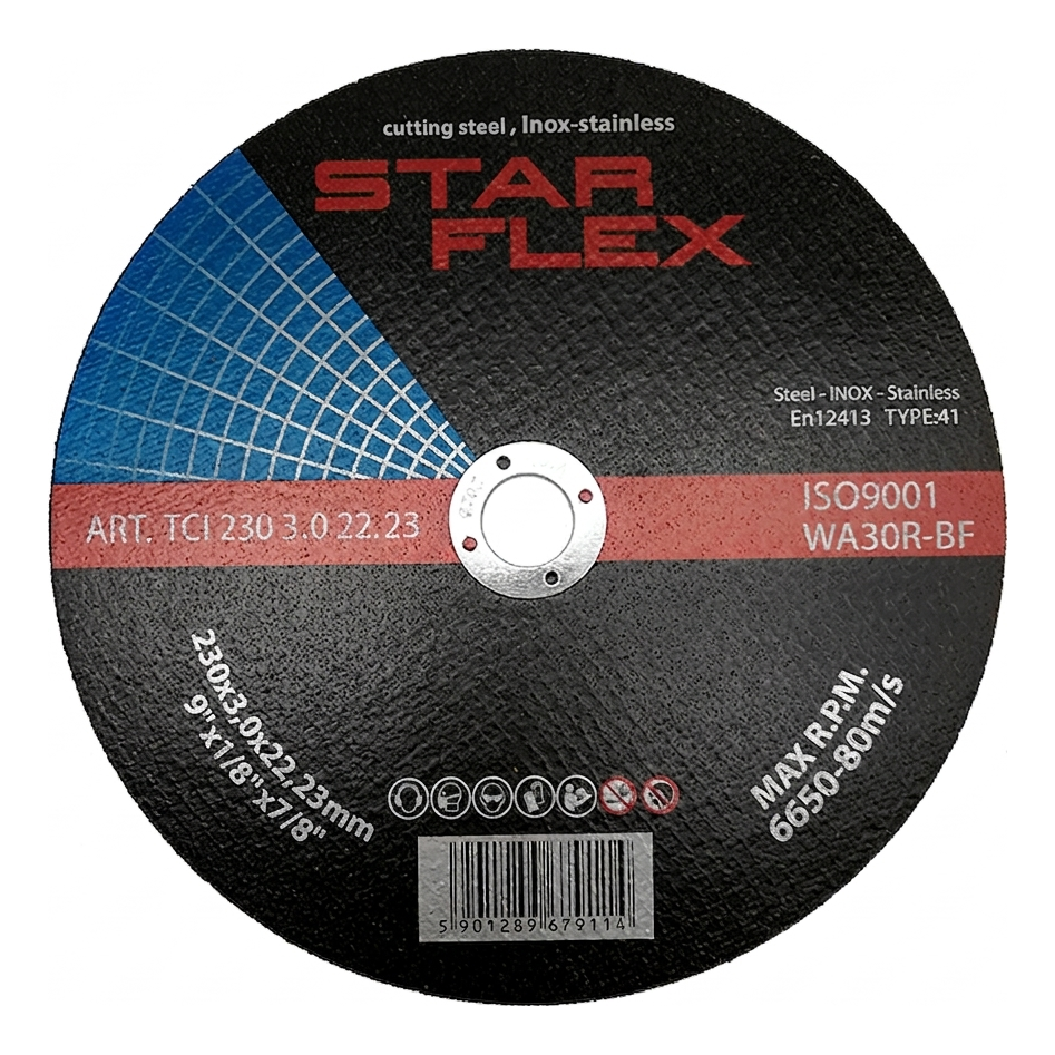 Starflex disco de corte 230 × 3,0 mm é uma ferramenta abrasiva resistente destinada ao corte preciso de aço carbono, inoxidável (INOX) e resistente a ácidos. Graças à dureza aumentada do abrasivo, o disco garante longa duração e rápido progresso de corte, traduzindo-se em poupança real de tempo e custos de materiais em obra ou oficina.