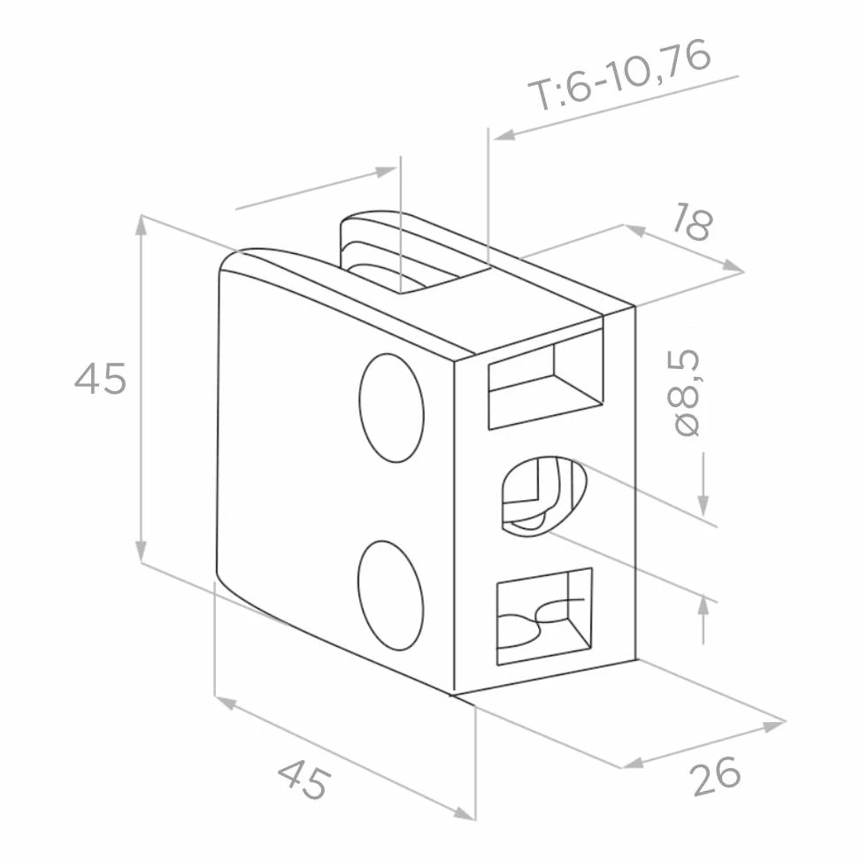 Suporte para vidro 45×45×26 mm com apoio e pino de segurança — solução de fixação robusta para painéis de vidro com espessura de 6 a 10,76 mm. Fabricado em aço inoxidável AISI 304 com acabamento polido (espelho), garante uma estética elegante e elevada resistência à corrosão. Concebido para montagem em superfícies planas — ideal para guardas, proteções e estruturas em vidro.