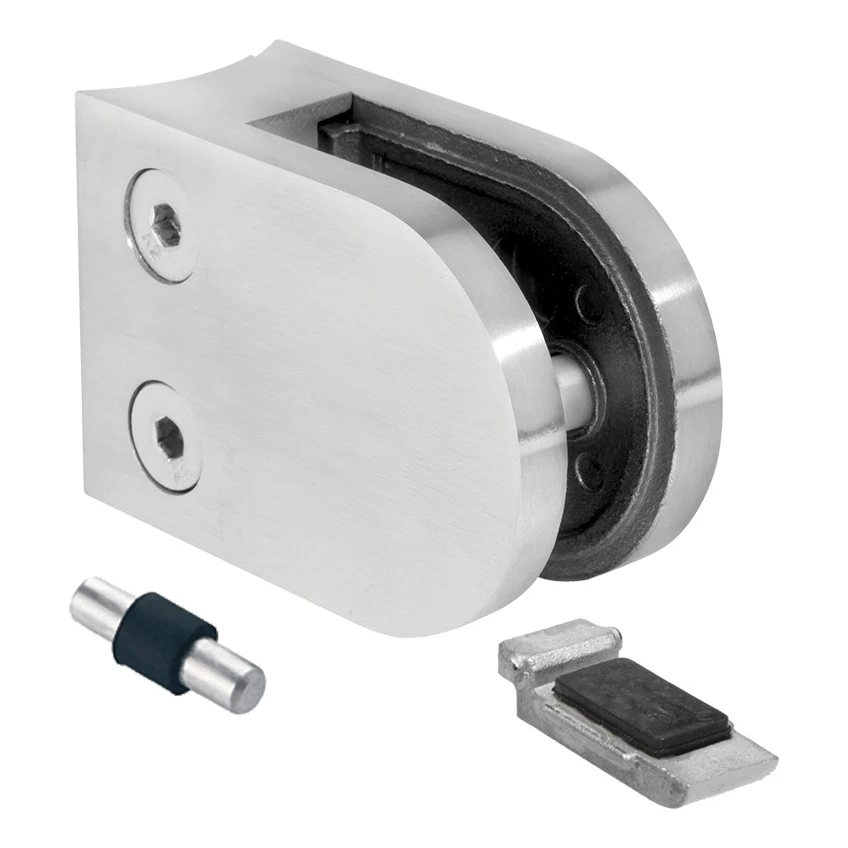 Suporte para vidro 63×45×30 mm com consola e pino de segurança — solução robusta para a montagem de painéis de vidro em guardas de escada e varandas com tubo Ø 42,4 mm. A forma arredondada e o acabamento acetinado em aço inoxidável AISI 304 conferem um aspeto estético e moderno à construção, enquanto o material utilizado garante elevada resistência à corrosão — tanto em interiores como em exteriores.